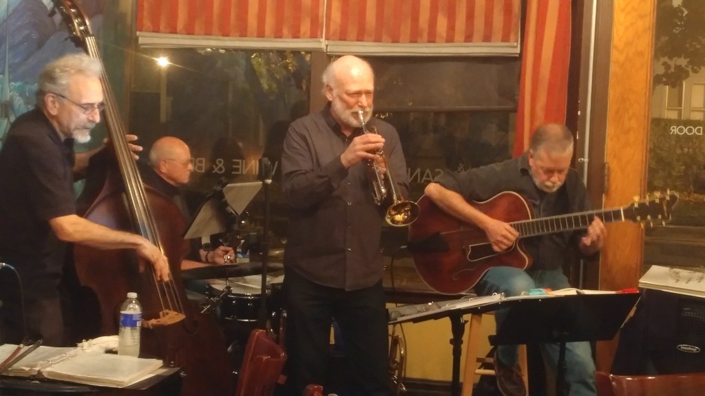 We can fit in a much tighter space when needed, like at Starry Nites Cafe (shown below). The overall footprint is about 8 X 8 feet, and the mic stays in the bag. Playing next to a window in a small space makes for a very live ambience, but we’re quiet enough that folks still can carry on conversations.